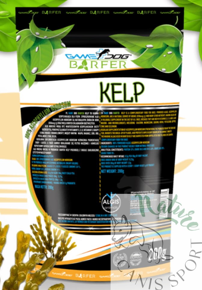BARFER Kelp to karma uzupełniająca dla psów. Sproszkowane algi Ascophyllun nodosum są naturalnym źródłem jodu (836mcg/g) oraz wielu innych składników odżywczych.