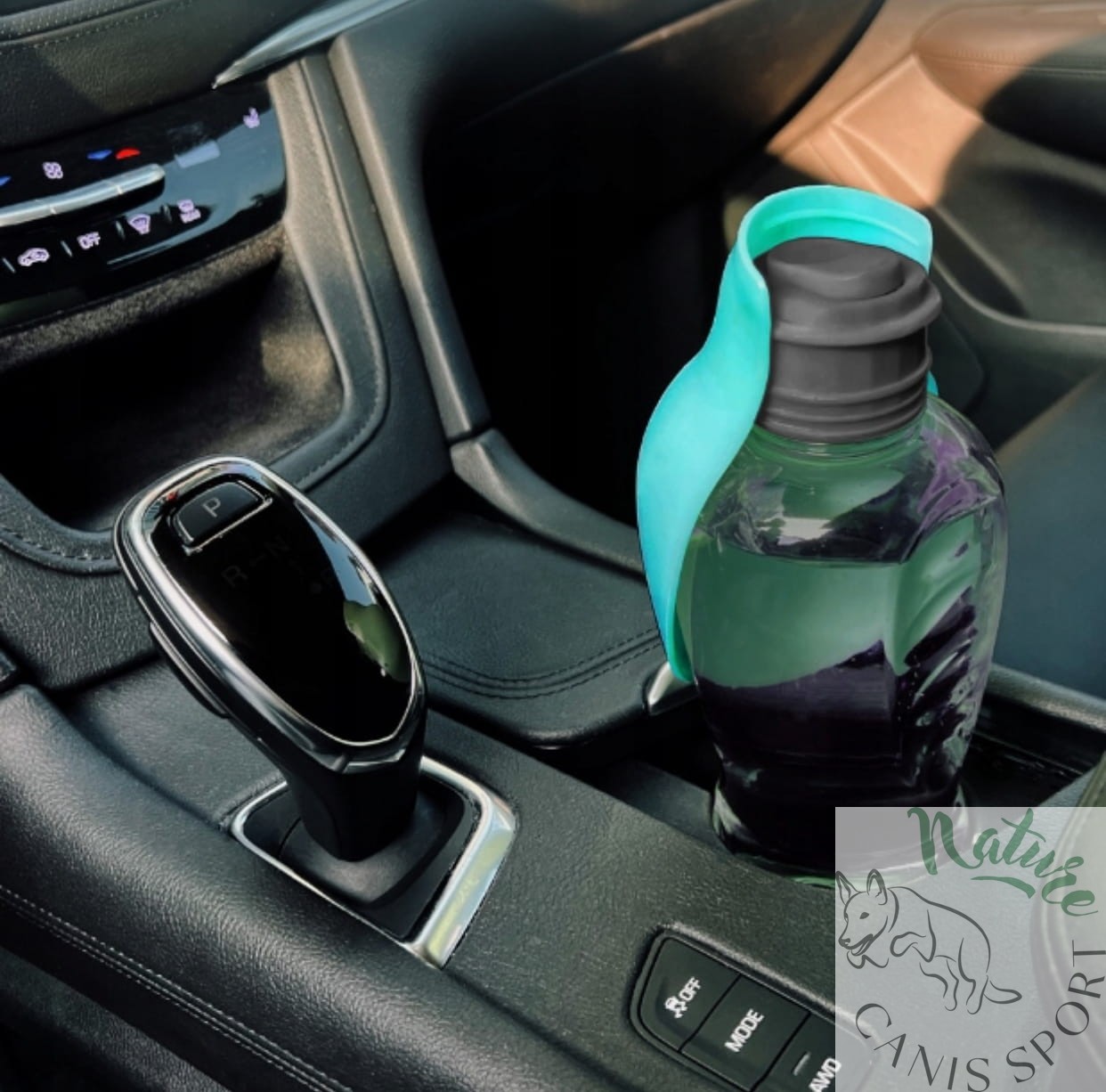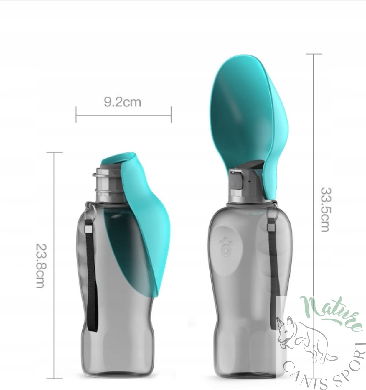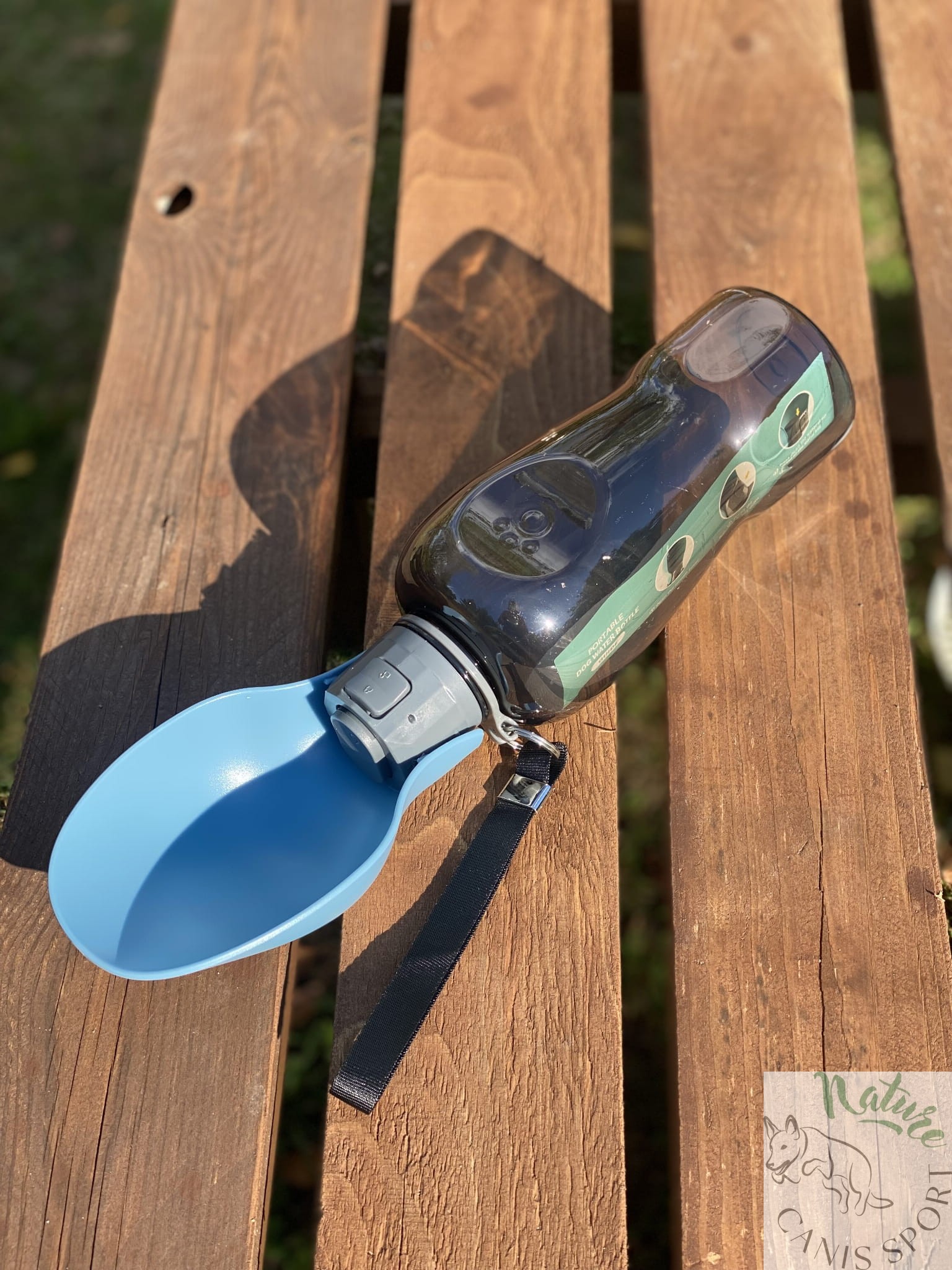 Specjalne profilowanie butelki sprawia, że można ją po prostu położyć na ziemi, bez konieczności trzymania jej pod czas pojenia psa.