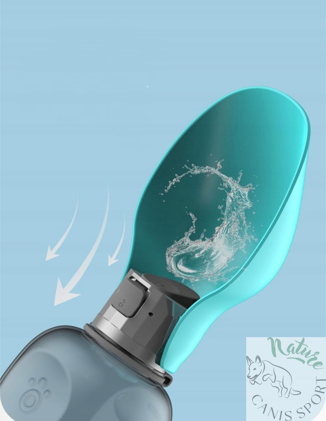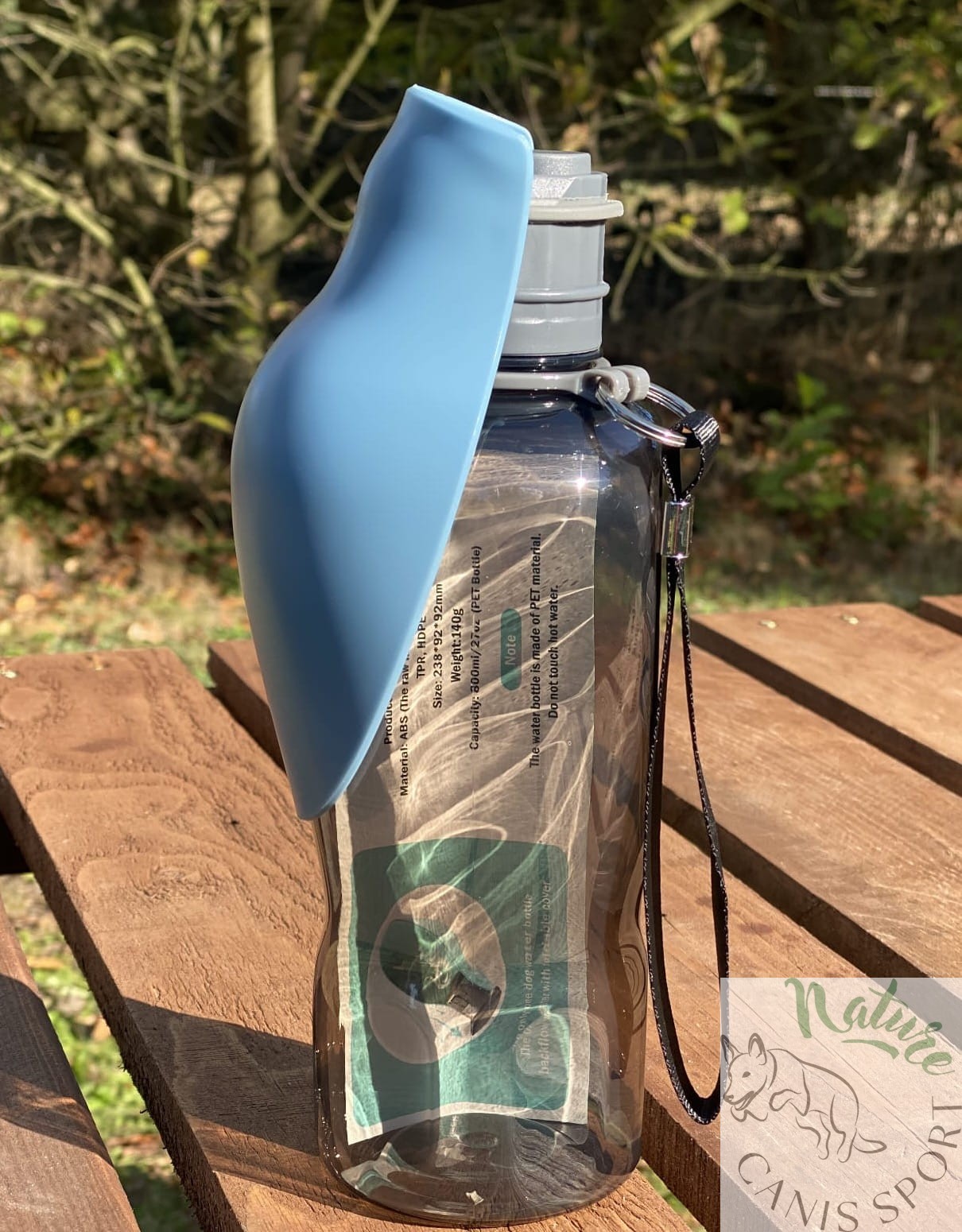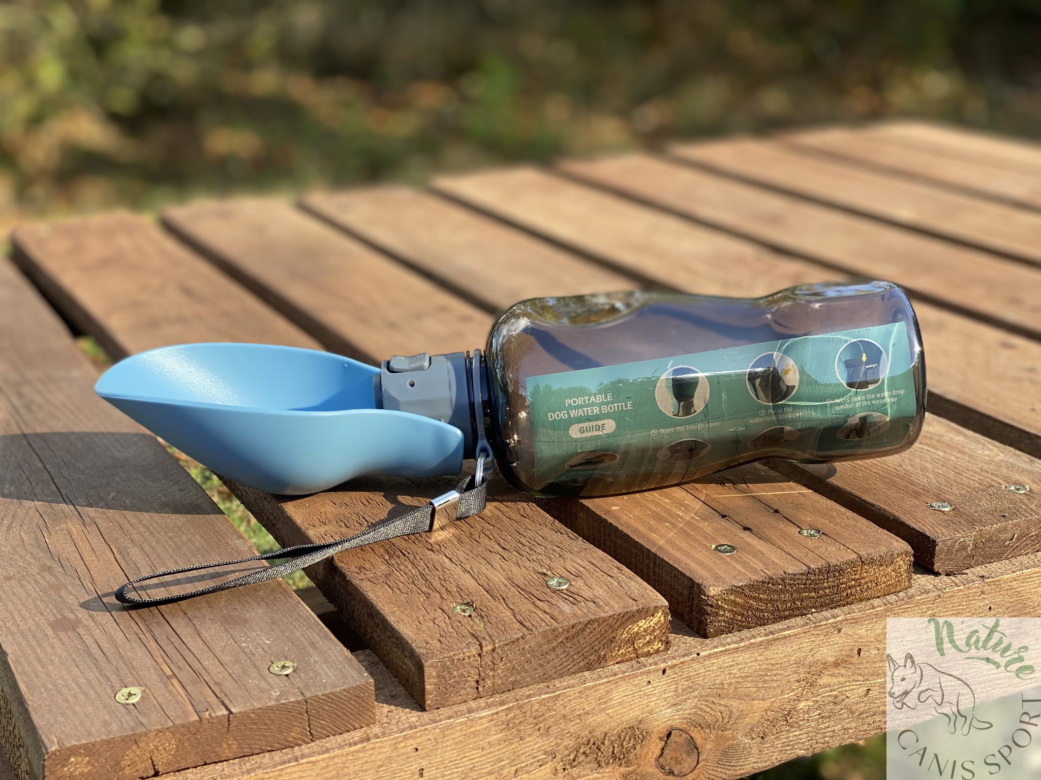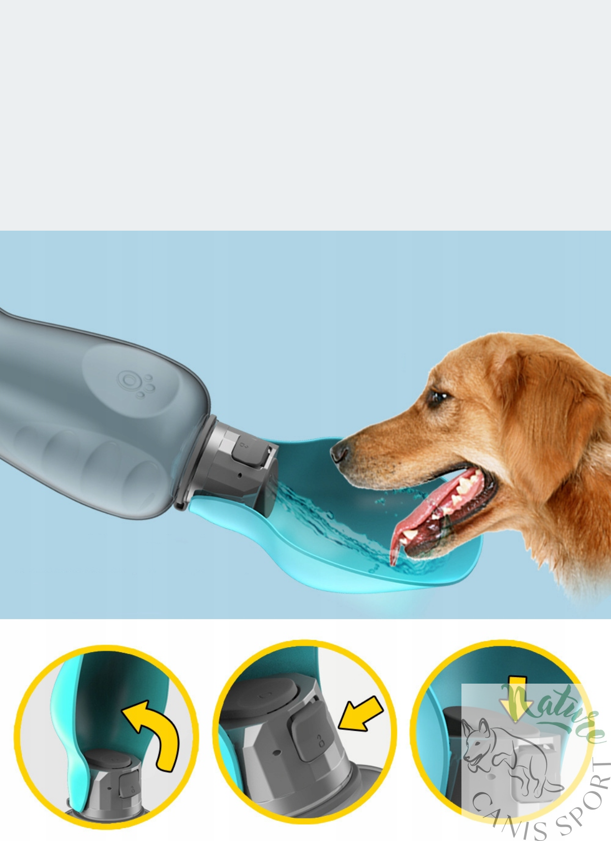 Specjalne profilowanie butelki sprawia, że można ją po prostu położyć na ziemi, bez konieczności trzymania jej pod czas pojenia psa.