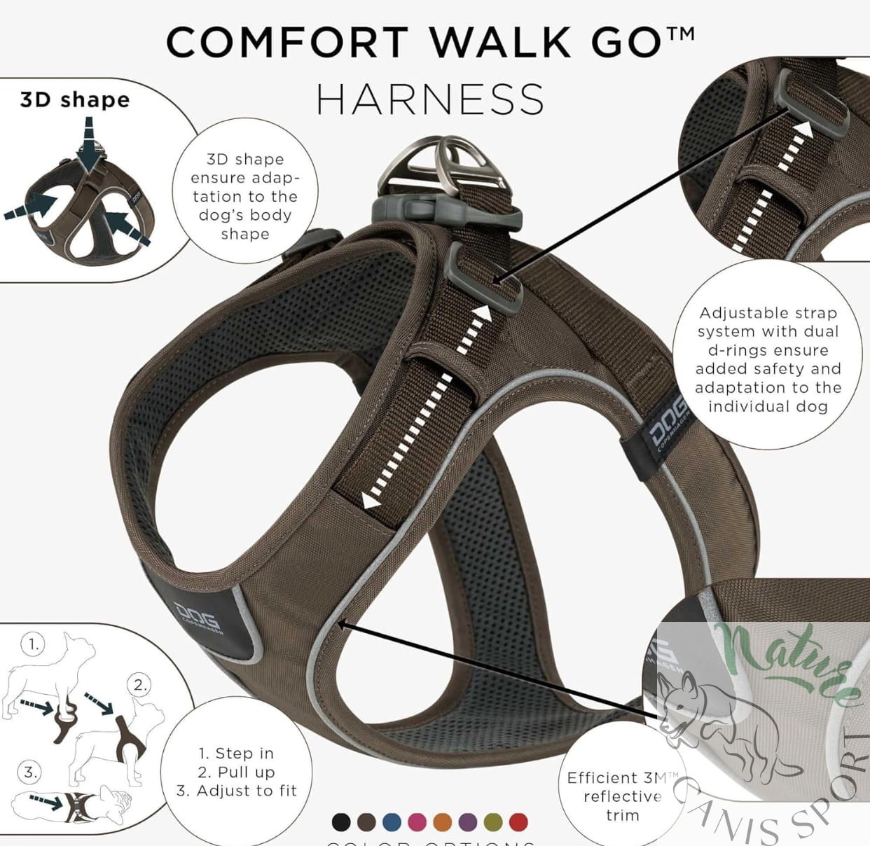 Regulowane paski zamykające, duże zapięcie na łańcuszek i kształt 3D zapewniają różnorodne dopasowanie do indywidualnego kształtu ciała psa i zapewniają bezpieczne spacery. Ergonomiczna konstrukcja chroni plecy i szyję psa.