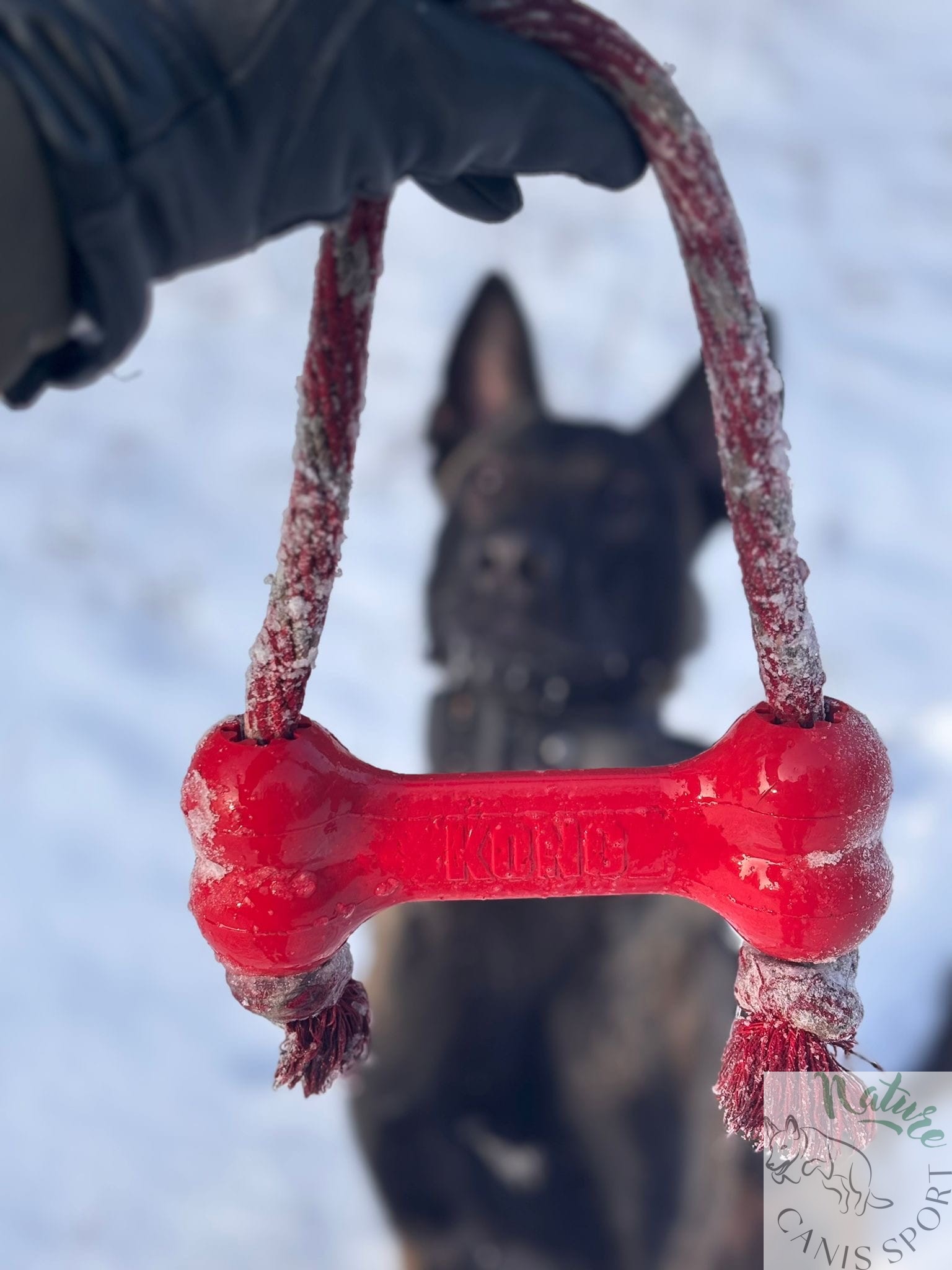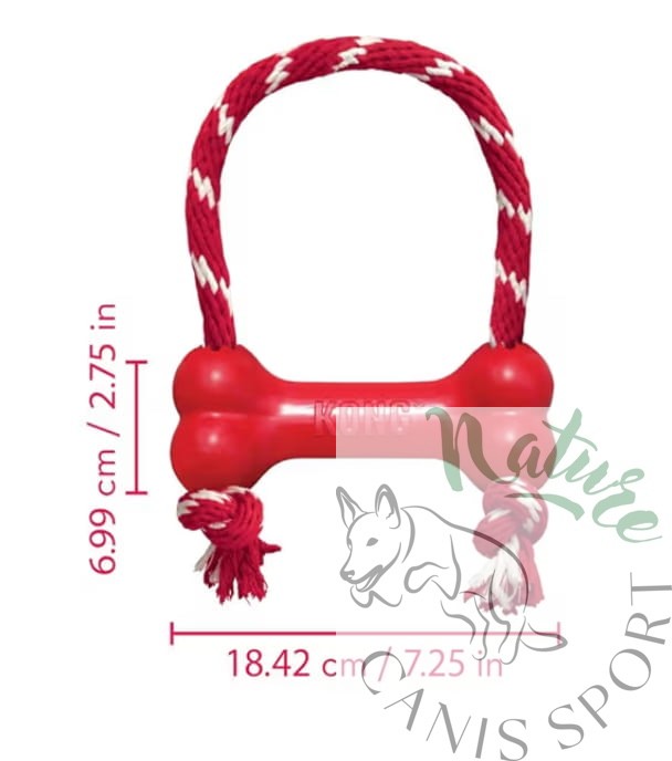 Unikalny kształt tej zabawki z trwałego kauczuku sprawia, że jest idealna do gryzienia, a dzięki sznurkowi może być używana jako szarpak. Dzięki legendarnej wytrzymałości i jakości KONG jest polecany przez psich trenerów oraz lekarzy weterynarii.