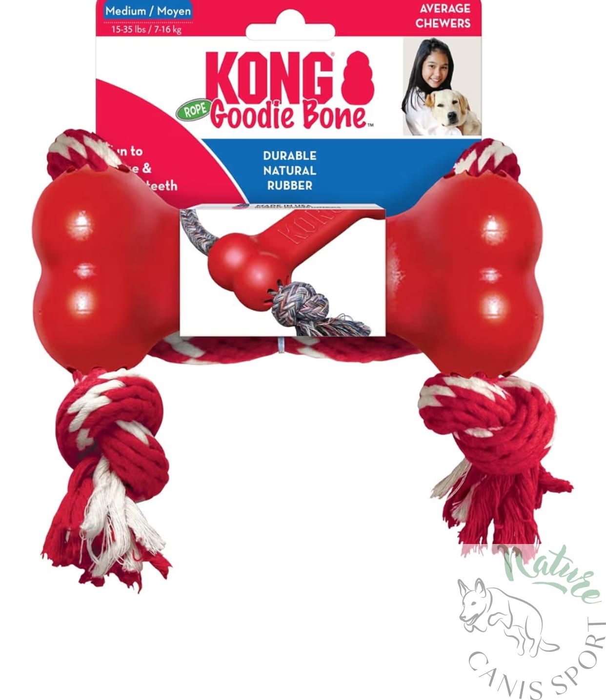 Kong Goodie Bone - kość ze sznurem - wytrzymała gumowa zabawka w kształcie kości z sznurem do przeciągania.