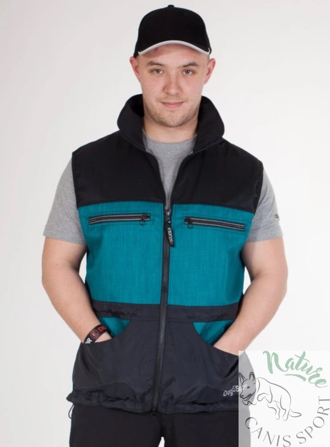 Kamizelka posiada sznurek ściągający u dołu oraz wszytą gumkę z tyłu w pasie.
