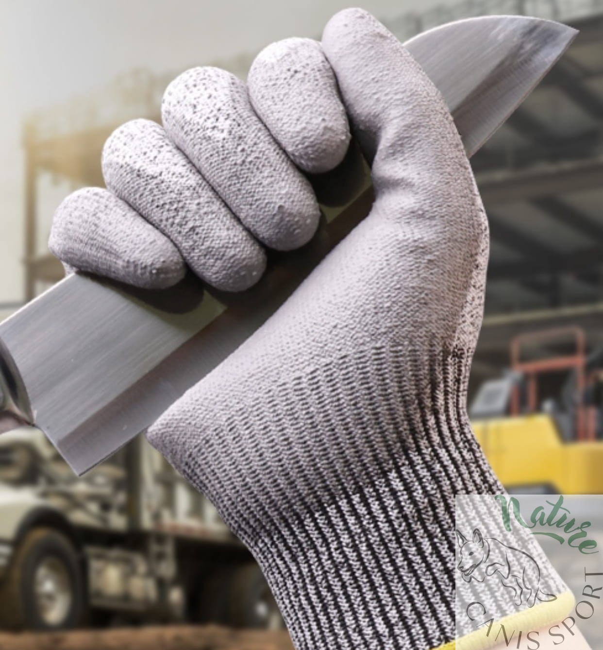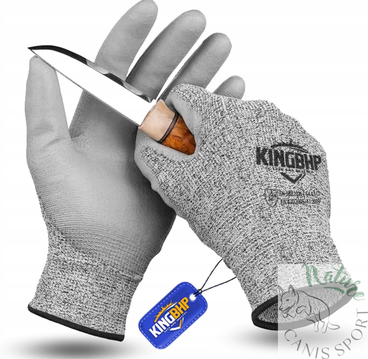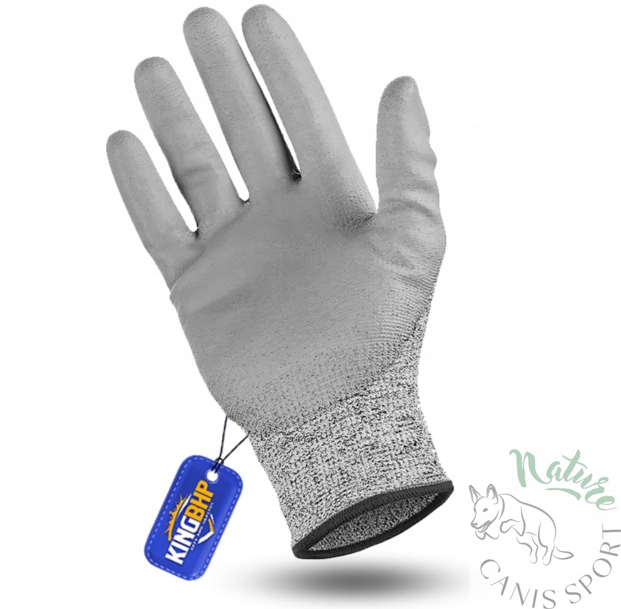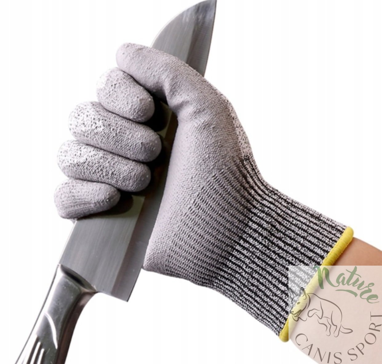 Rękawice ochronne antyprzecięciowe dziane bezszwowe, wykonane ze specjalnej dzianiny antyprzecięciowej (PE-UHMW), nić biało - czarna, powlekane w części chwytnej szarym poliuretanem, zakończone ściągaczem.