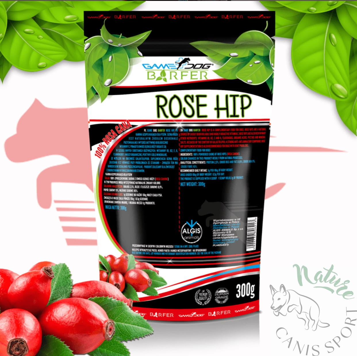 Rose hip BARFER to suplement diety dla psów. Dzika róża jest naturalnym źródłem doskonale przyswajalnej witaminy C, która poprawia odporność, wspomaga syntezę kolagenu i mazi stawowej.
