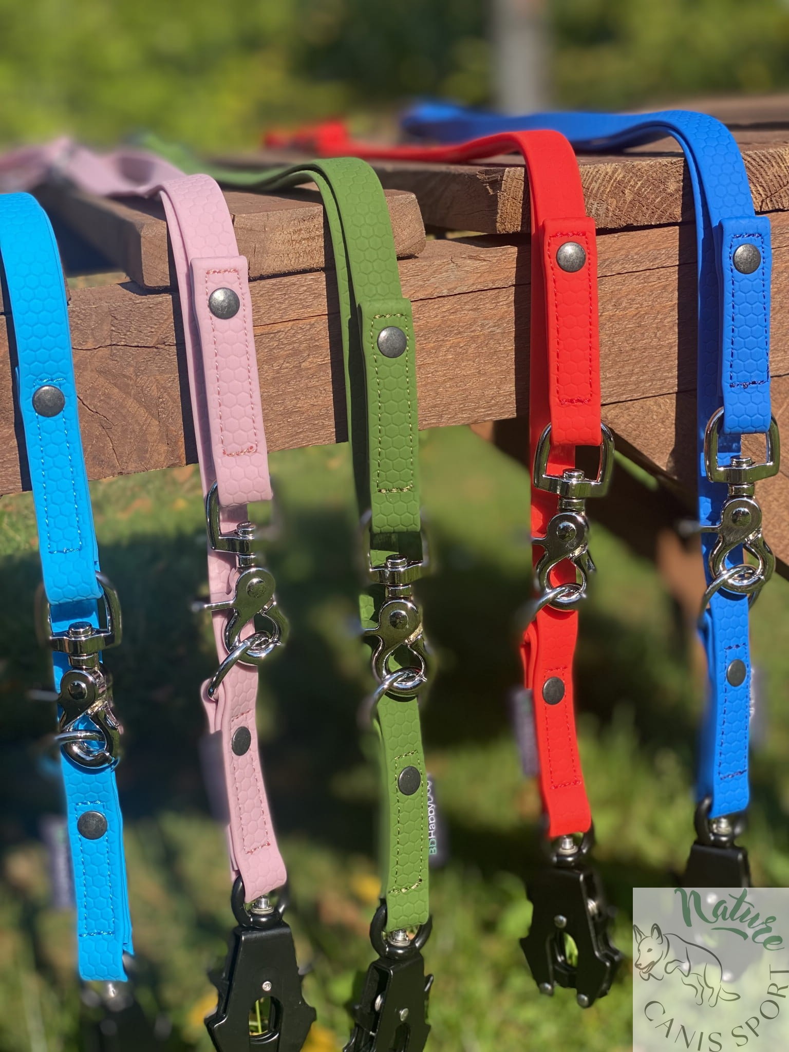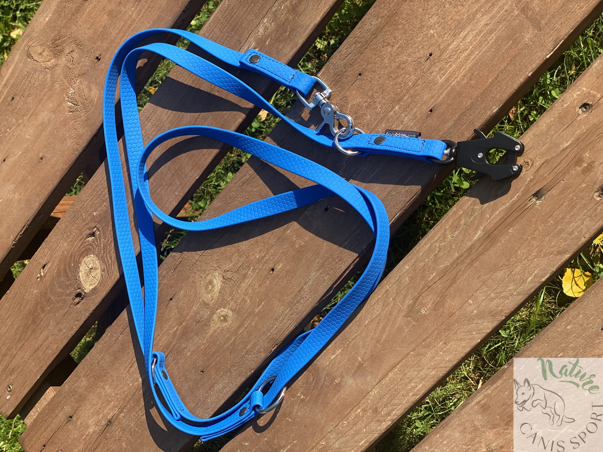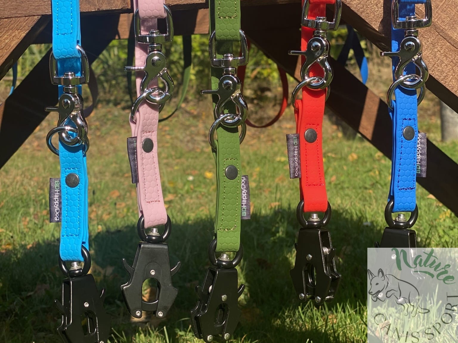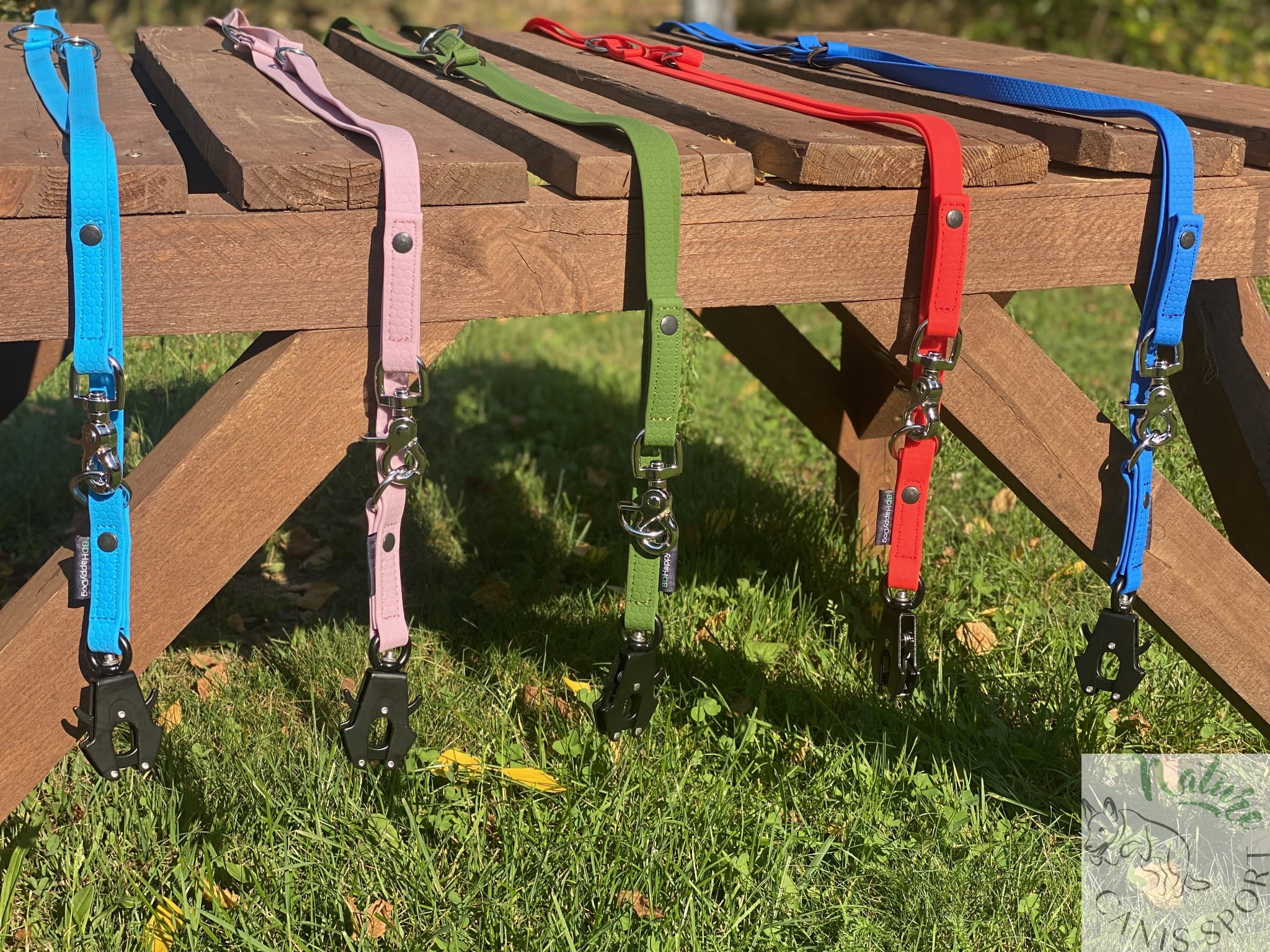 Smycz posiada 3-stopniową regulację długości - wystarczy przepiąć karabińczyk na wybranej długości.