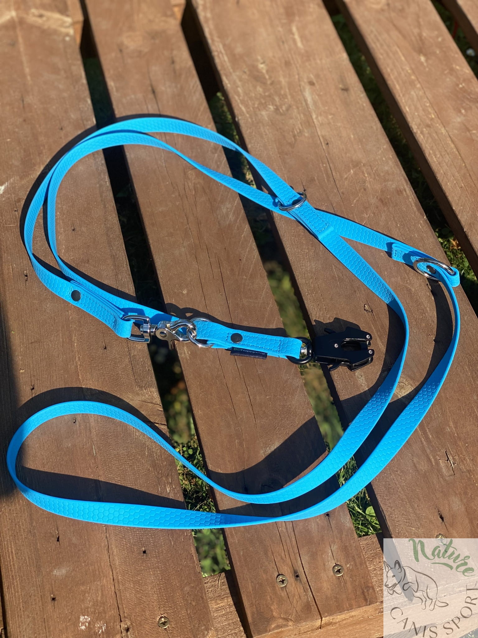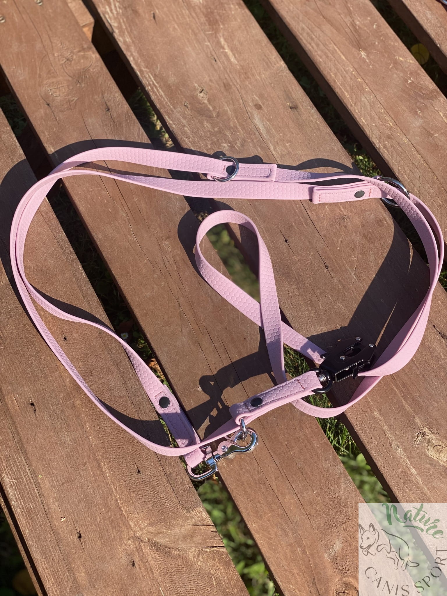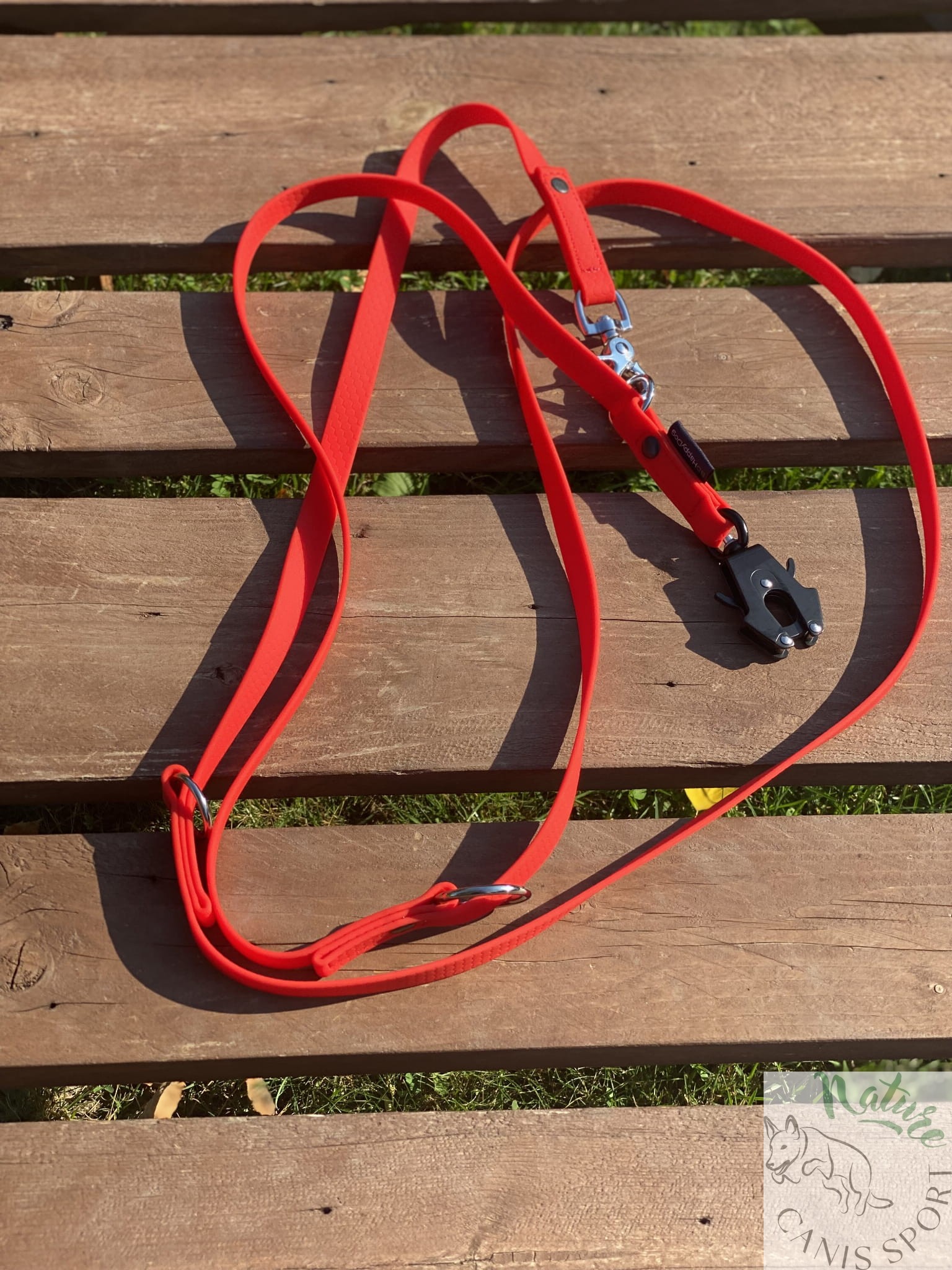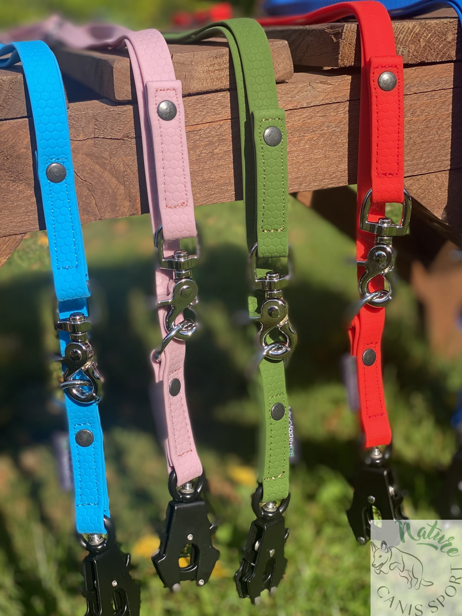 Smycz posiada 3-stopniową regulację długości - wystarczy przepiąć karabińczyk na wybranej długości.
