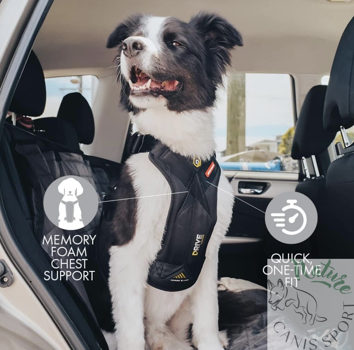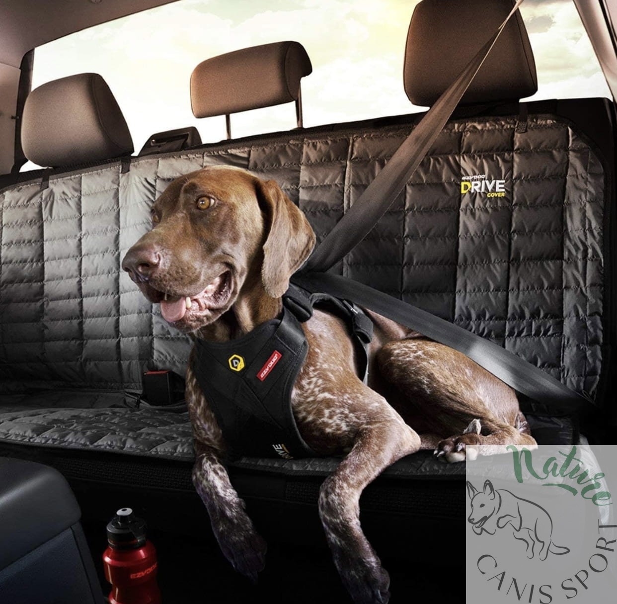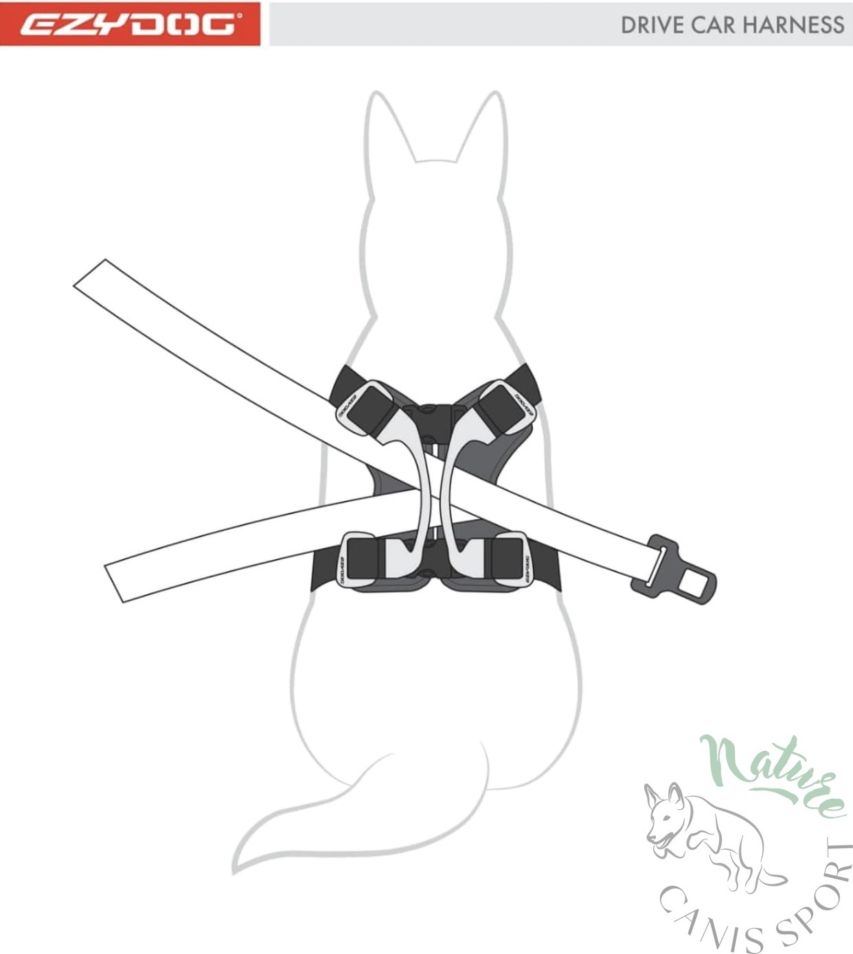 Regulowane szelki samochodowe EzyDog DRIVE do bezpiecznego przewożenia psa w samochodzie.