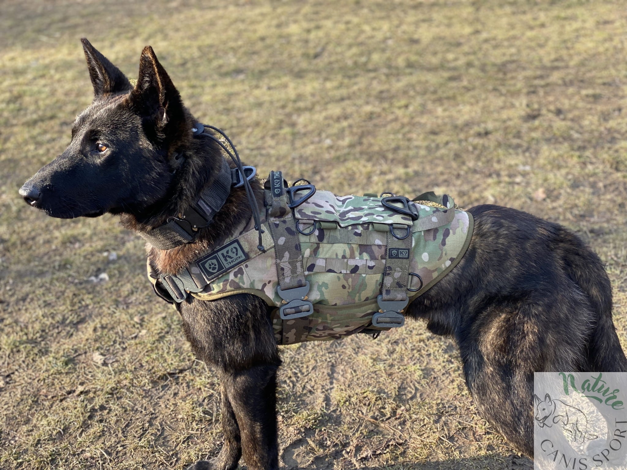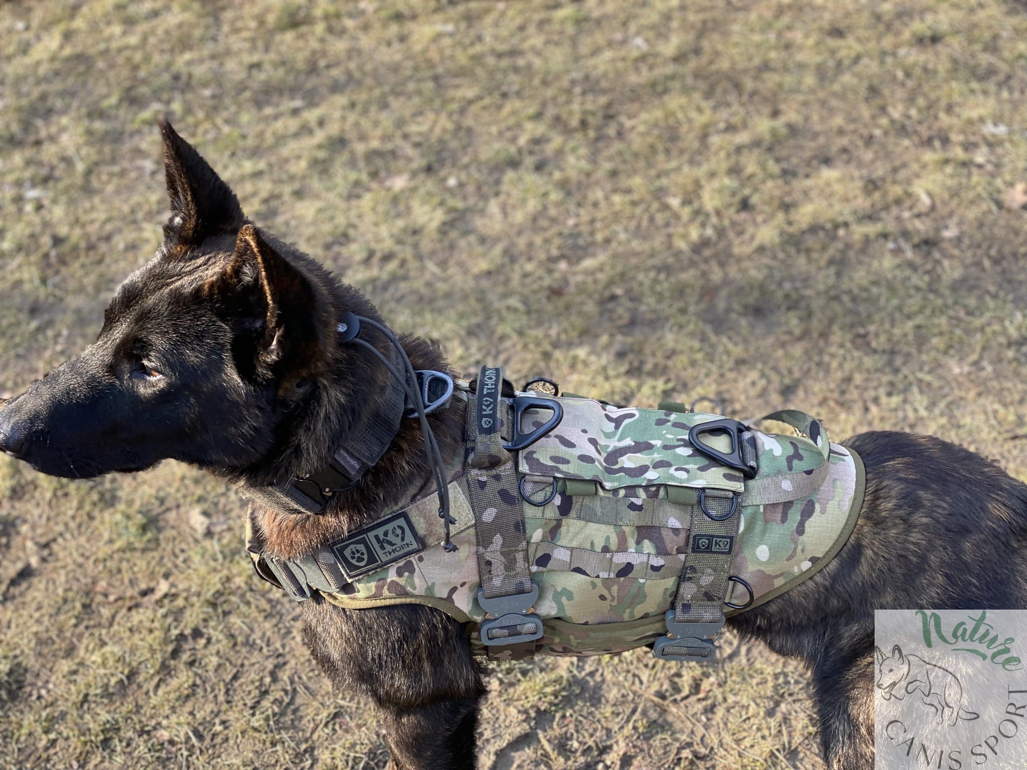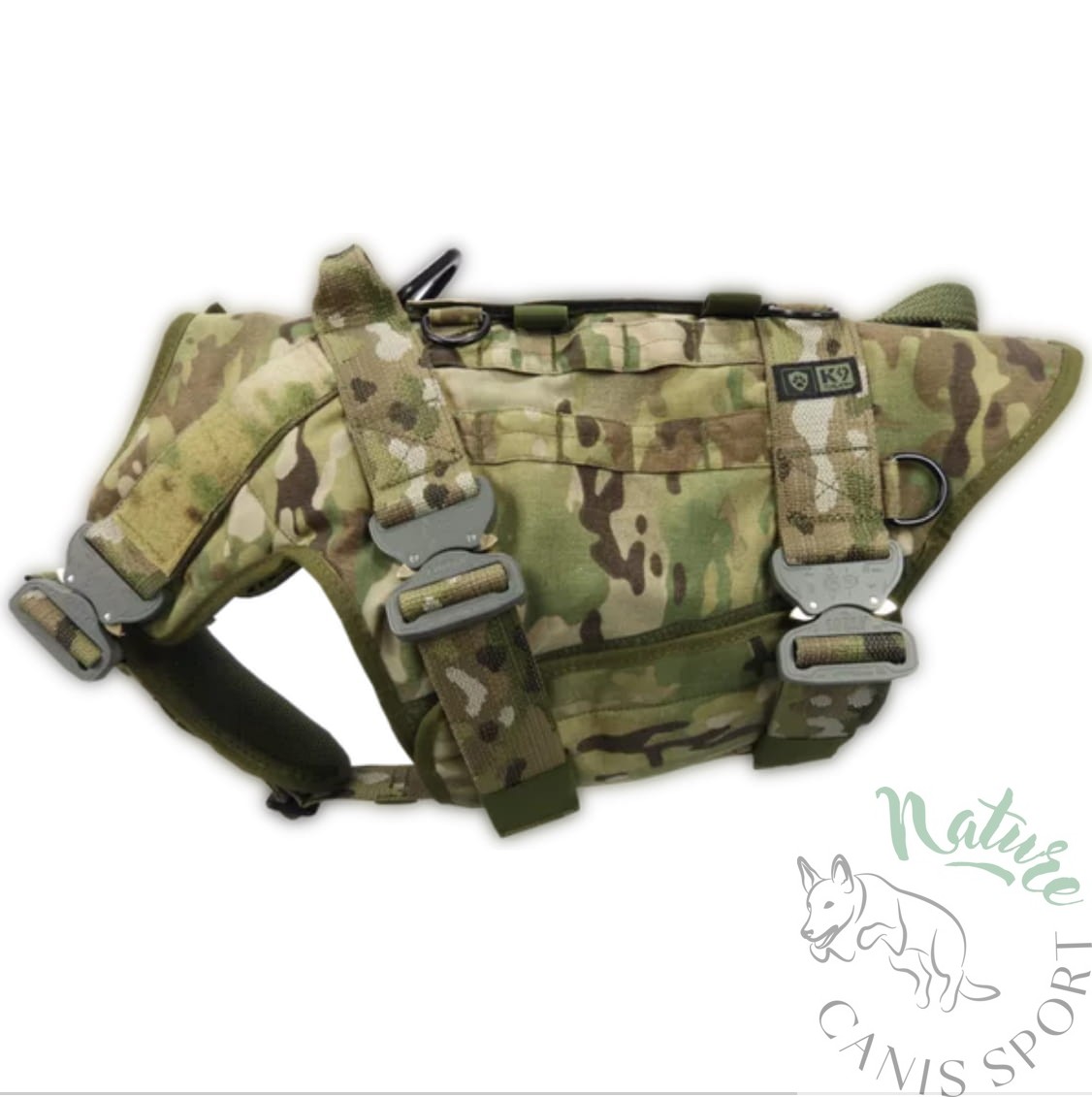 Uprząż posiada uchwyty do podnoszenia psa, V-ringi aluminiowe o wytrzymałości 20 kN do podpięcia psa przy transporcie linowym i podwójny zestaw pasów pod klatką piersiową. Pasy mają wytrzymałość 20 kN i odpowiednio dużą regulację. Taśma poliamidowa Pa6, wytrzymałość 20kN, grubość taśmy 2,2mm, średnio-sztywna. Taśmy poliamidowe, w porównaniu do innego rodzaju taśm (poliestrowe, polipropylenowe, bawełniane) mają największą trwałość, estetykę i jedną z największych wytrzymałości. Taśmy poliamidowe są odporne na warunki pogodowe, kolor jest trwały, taśma w normalnym zastosowaniu nie ulega przetarciu, nie strzępi się, nie rozplata się.