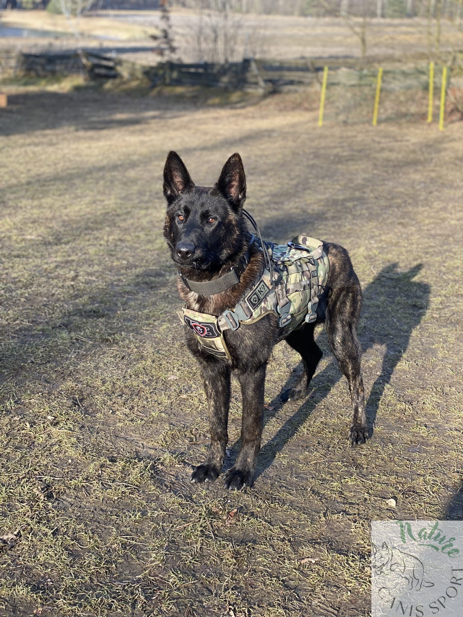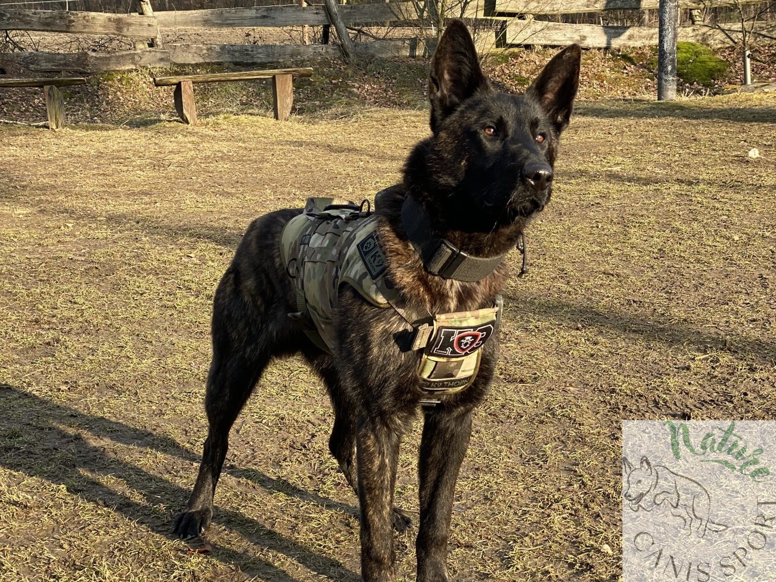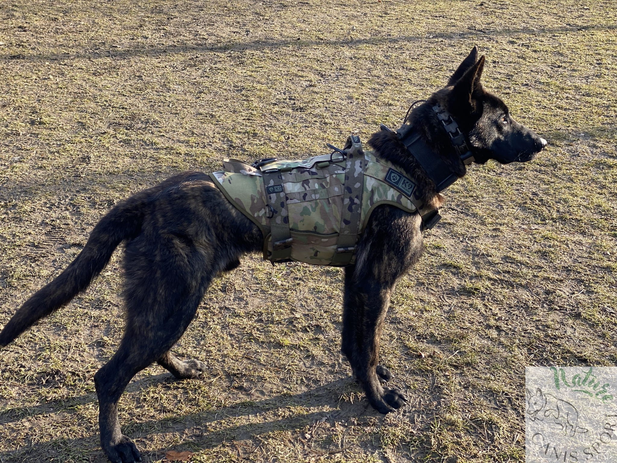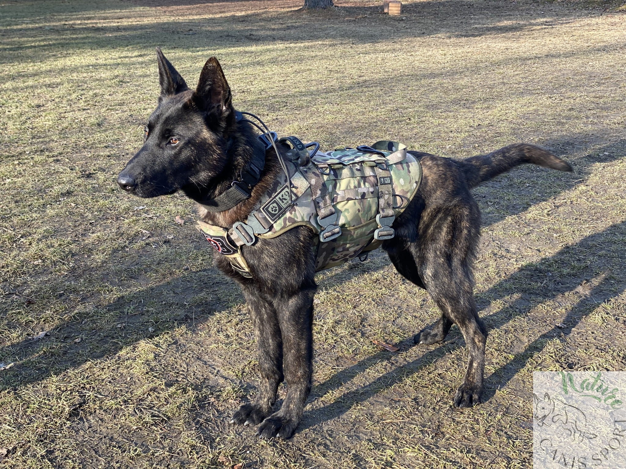 Uprząż posiada uchwyty do podnoszenia psa, V-ringi aluminiowe o wytrzymałości 20 kN do podpięcia psa przy transporcie linowym i podwójny zestaw pasów pod klatką piersiową. Pasy mają wytrzymałość 20 kN i odpowiednio dużą regulację. Taśma poliamidowa Pa6, wytrzymałość 20kN, grubość taśmy 2,2mm, średnio-sztywna. Taśmy poliamidowe, w porównaniu do innego rodzaju taśm (poliestrowe, polipropylenowe, bawełniane) mają największą trwałość, estetykę i jedną z największych wytrzymałości. Taśmy poliamidowe są odporne na warunki pogodowe, kolor jest trwały, taśma w normalnym zastosowaniu nie ulega przetarciu, nie strzępi się, nie rozplata się.